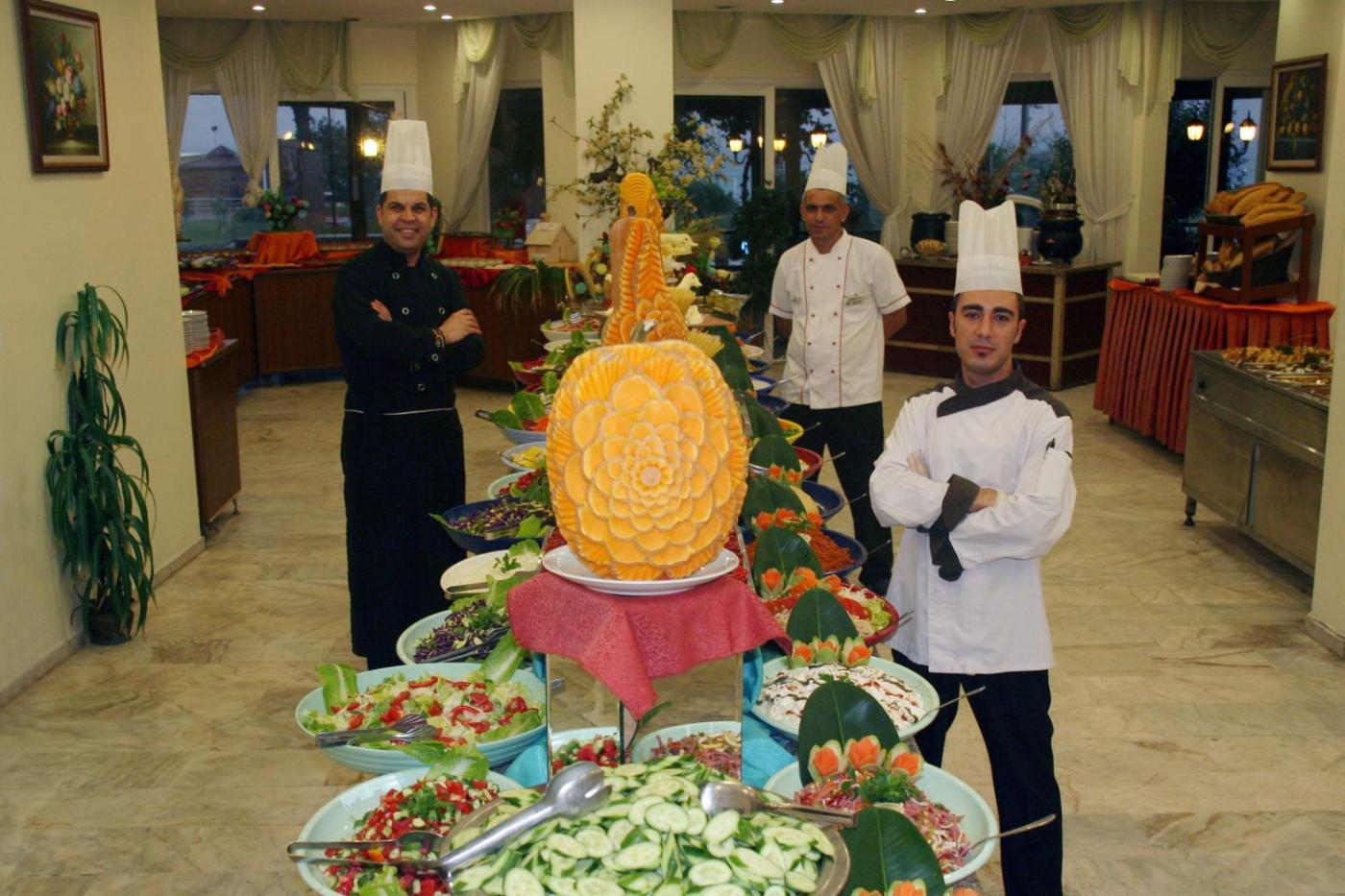 The buffet and à la carte restaurant serves a range of local and international dishes. Regional drinks are served at the bar. The Kleopatra offers room service as well.